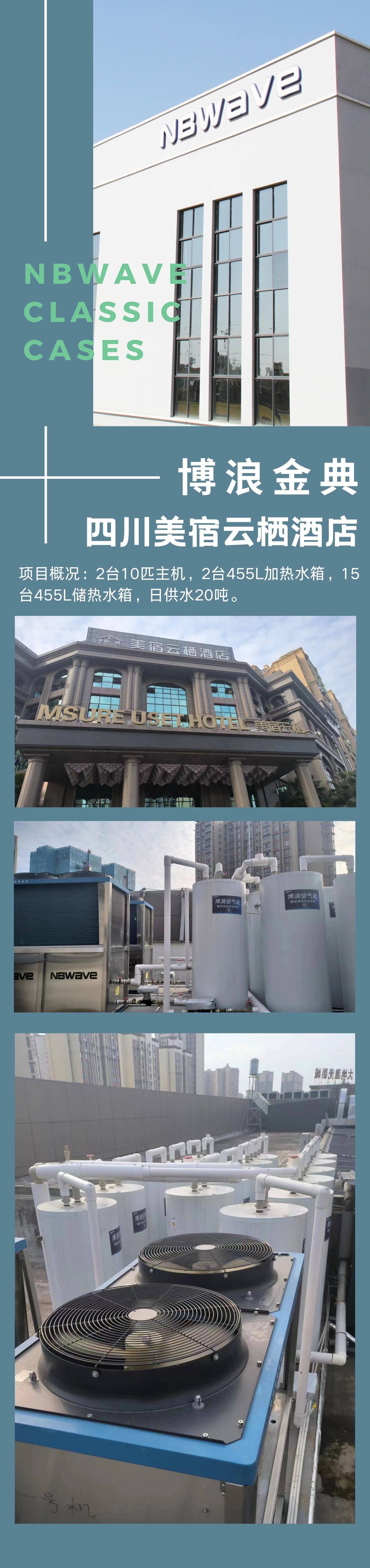 采用產品:2臺10匹主機,2臺455L加熱水箱,15臺455L儲熱水箱,日供水20噸。